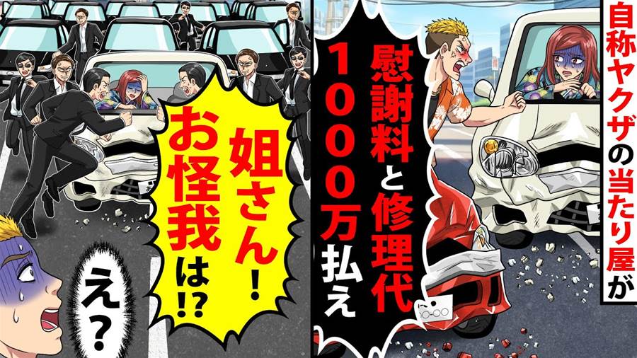 自称ヤクザの当たり屋が「慰謝料と修理代1000万払え!」→すると後続の黒塗りの車から本物のヤクザが降りてきて「姐さん!お怪我は!?」